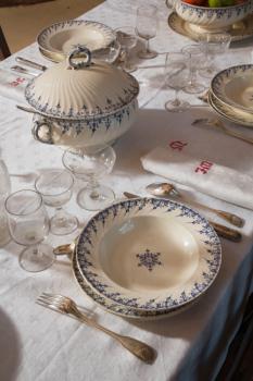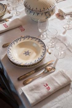 Château de Castelnau-Bretenoux, table dressée dans l'oratoire avec le linge de maison et la vaisselle de Jean Mouliérat