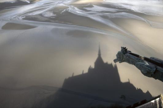 Ombre de l'abbaye du Mont-Saint-Michel sur le sable de la baie