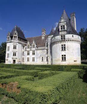 Château de Puyguilhem, vue d'ensemble côté est et labyrinthe de buis