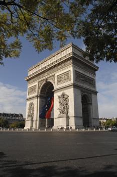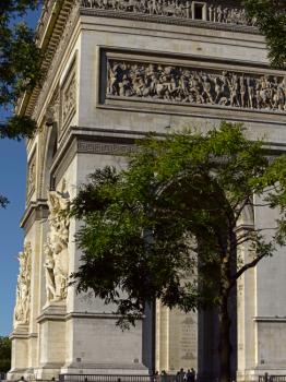 Arc de triomphe de l'Étoile, côté sud-est, vue partielle derrière des arbres de la place