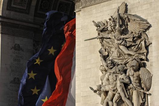 Drapeaux français et européen flottant sous l'Arc de triomphe de l'Étoile