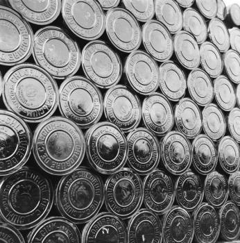 Quai de l'Oise à Paris, bidons empilés vus de face, donnant l'impression de pièces de monnaie debout