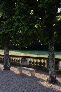 Château de Bouges, banc de pierre et buis taillé du parterre ouest