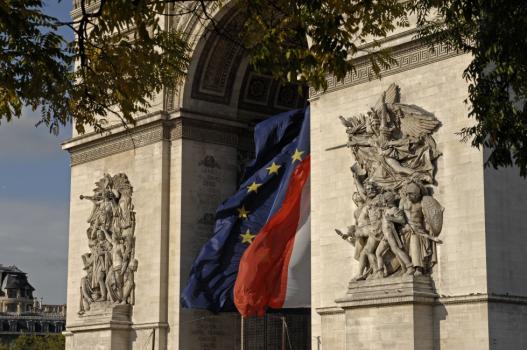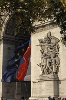 Drapeaux français et européen flottant sous l'Arc de triomphe de l'Étoile
