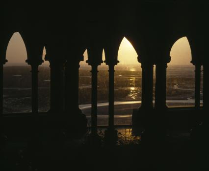 La baie du Mont-Saint-Michel au crépuscule vue à travers les baies de la façade occidentale du cloître