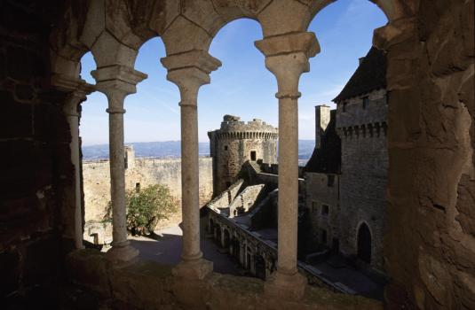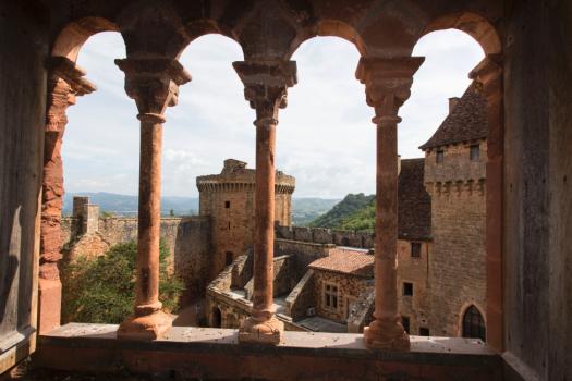Château de Castelnau-Bretenoux, la tour d'artillerie et les vestiges du logis du XVIIe siècle vus à travers les colonnettes d'une baie de la tour-résidence