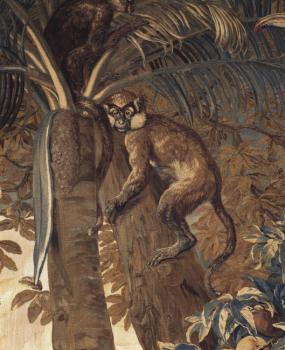 Tapisserie, "la Négresse portée dans un hamac", détail sur un singe grimpé à un palmier