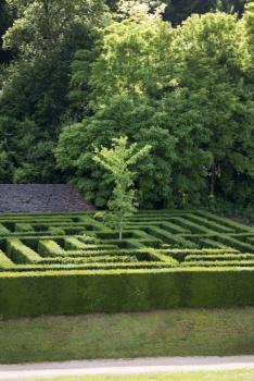 Château de Puyguilhem, vue d'ensemble côté est et labyrinthe de buis