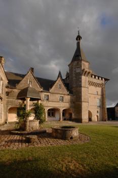 Château d'Aulteribe, façade ouest, entre les deux tours sud, au coucher du soleil