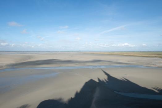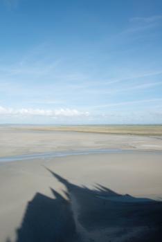 Ombre de l'abbaye du Mont-Saint-Michel sur le sable de la baie