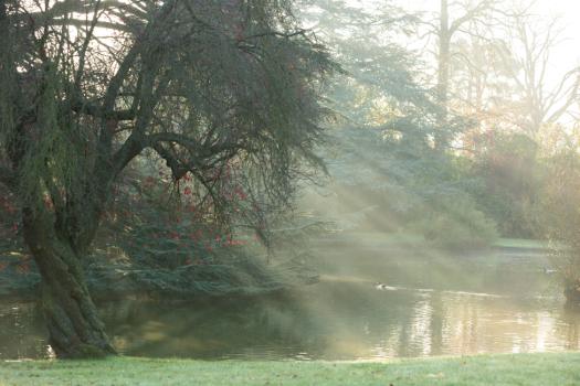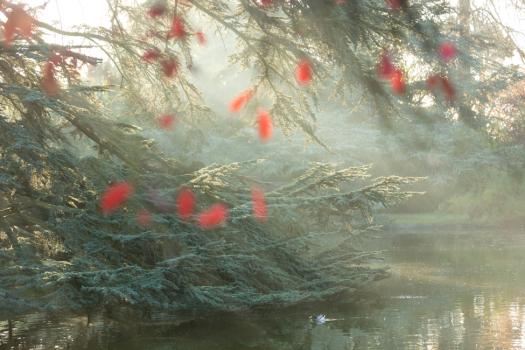 Domaine national de Saint-Cloud, parc, jardin du Trocadéro au lever du jour, prunier myrobolan pourpre (prunus ceracifera pissardii) au premier plan