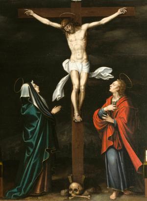 Le Christ en croix accompagné de donateurs, détail de la scène centrale