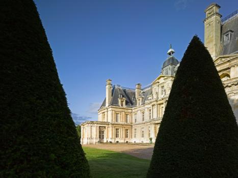 Château de Maisons, ensemble sud ouest, illumination de la façade sur jardin vue depuis la terrasse