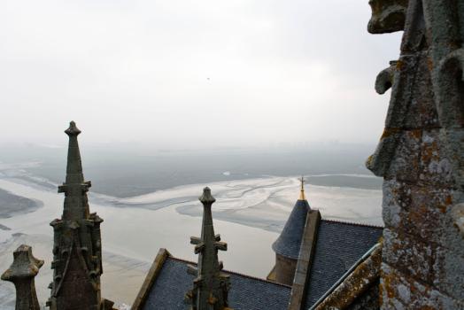Abbaye du Mont-Saint-Michel, église abbatiale, pinacles des arcs-boutants du chevet et vue sur le Couesnon et les pré-salés