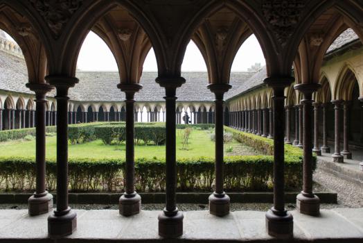 Abbaye du Mont-Saint-Michel, le cloître vu à travers les colonnettes de la galerie est