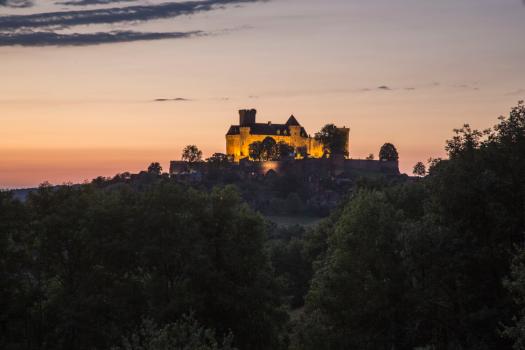 Château de Castelnau-Bretenoux, vue d'ensemble à la tombée de la nuit