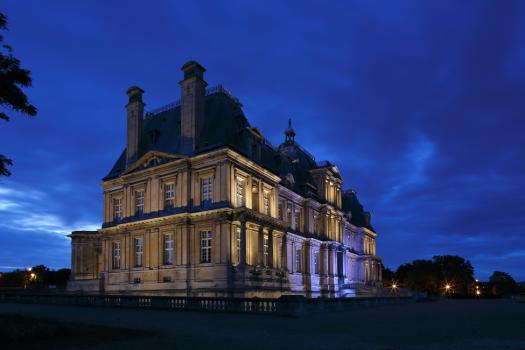 Château de Maisons, ensemble sud ouest, illumination de la façade sur jardin vue depuis la terrasse