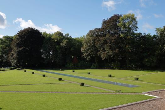 Villa Cavrois, ensemble de la façade sud au crépuscule depuis l'extrémité du miroir