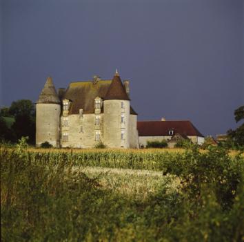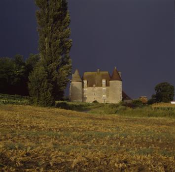 Château d'Aulteribe, façade ouest, entre les deux tours sud, au coucher du soleil