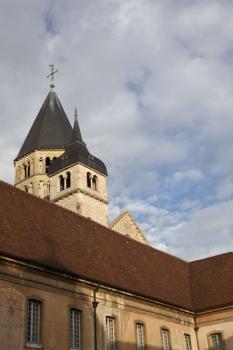 Abbaye de Cluny, clocher de l'Eau bénite et tour de l'Horloge vus du parc