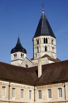 Abbaye de Cluny, clocher de l'Eau bénite et tour de l'Horloge vus du cloître
