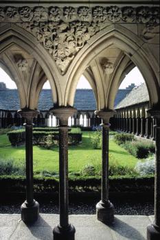 Abbaye du Mont-Saint-Michel, le cloître vu à travers les colonnettes de la galerie est