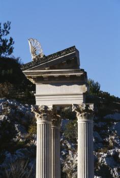 Site archéologique de Glanum, centre monumental, petit temple géminé, détail du fronton