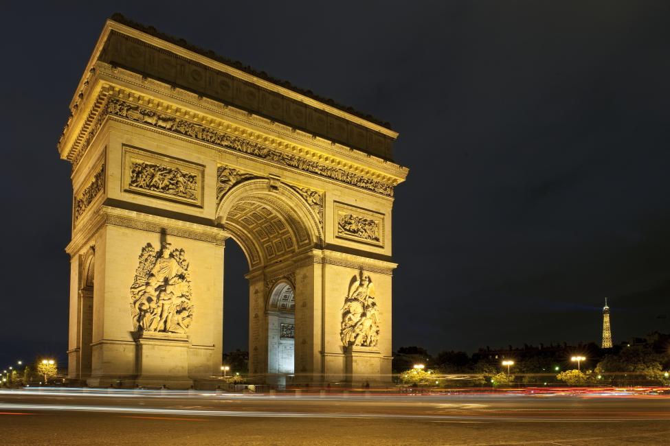 Arc de triomphe de l'Étoile, de nuit, côté nord-ouest, depuis l'avenue Carnot